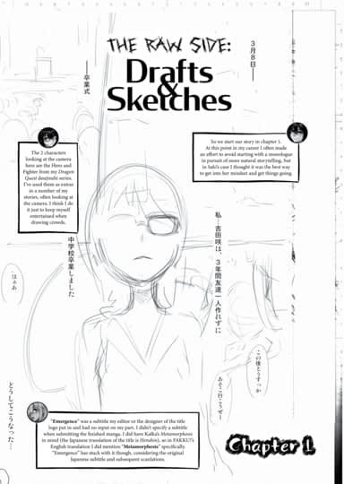 - The Raw Side: Drafts and Sketches: Early draft pages of the entire manga, annotated with author’s thoughts on the creative process. Includes sketches of alternate pages not seen in the final edition.